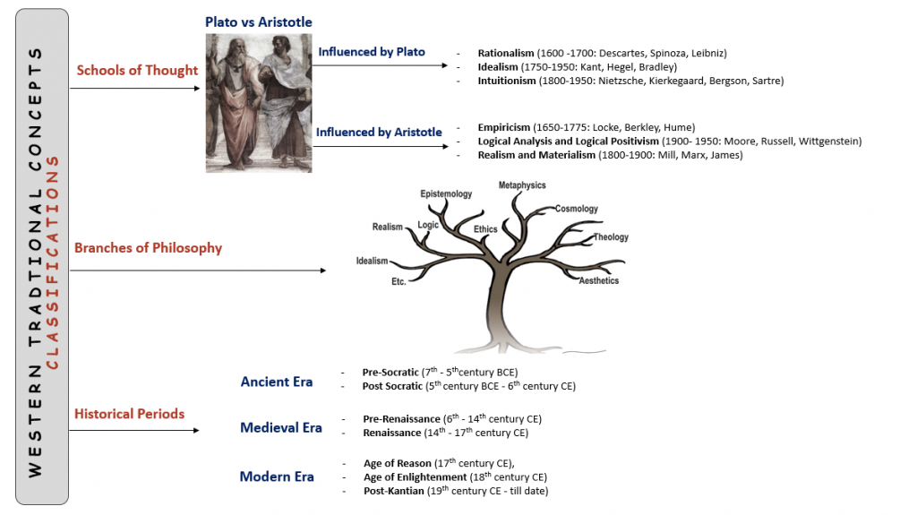 Based on the schools of thought, the Western philosophical thoughts can be broadly classified as: