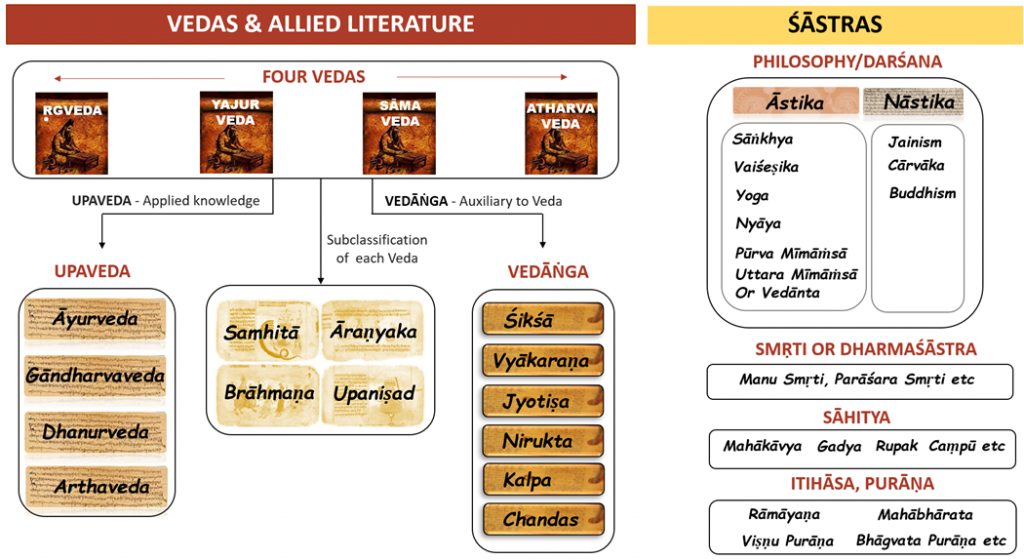 The copious Indian literature contains scriptures and texts such as Veda (वेद), Upaniṣad (उपनिषद्), Saṁhitā (संहिता), Brāhmaṇa (ब्राह्मण), Āraṇyaka (आरण्यक), Itihāsa (इतिहास), Purāṇa (पुराण), Śāstra (शास्त्र), Smṛti (स्मृति) or Dharmaśāstra (धर्मशास्त्र), etc. These are classified in different ways by various Schools of Thought. Broadly, this vast literature can be classified under two segments – Vedas and Śāstras.