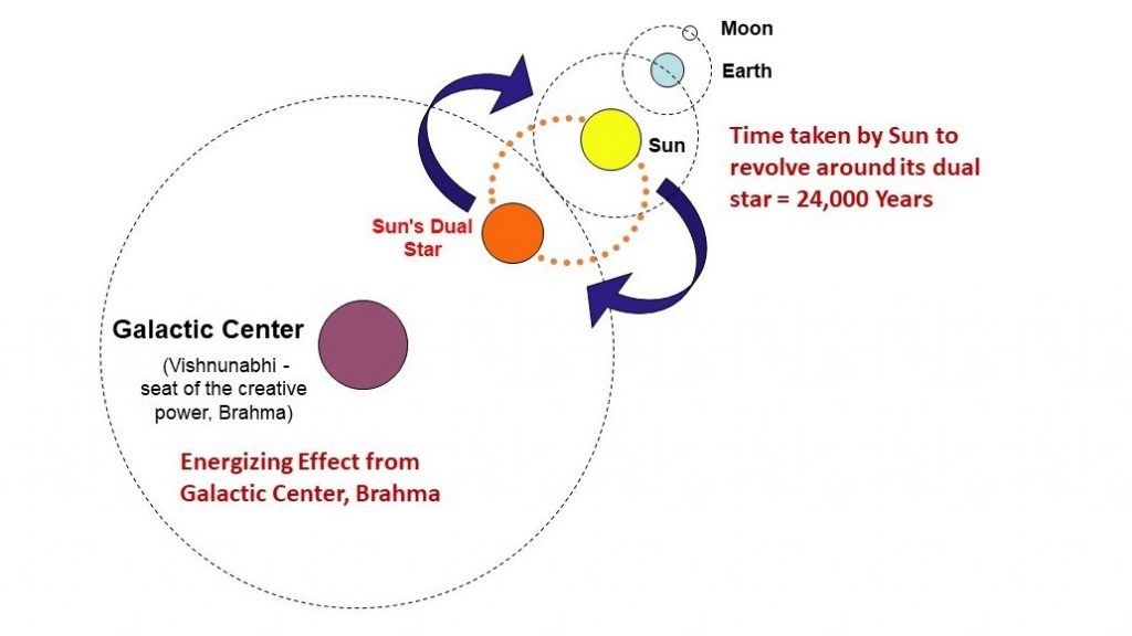 We learn from Oriental astronomy that moons revolve around their planets, and planets turning on their axes revolve with their moons round the sun; and the sun, with its planets and their moons, takes some star for its dual and revolves round it in about 24,000 years of our earth – a celestial phenomenon which causes the backward movement of the equinoctial points around the zodiac. The sun also has another motion by which it revolves round a grand centre called Vishnunabhi, which is the seat of the creative power, Brahma, the universal magnetism. Brahma, regulates dharma, the mental virtue of the internal world.