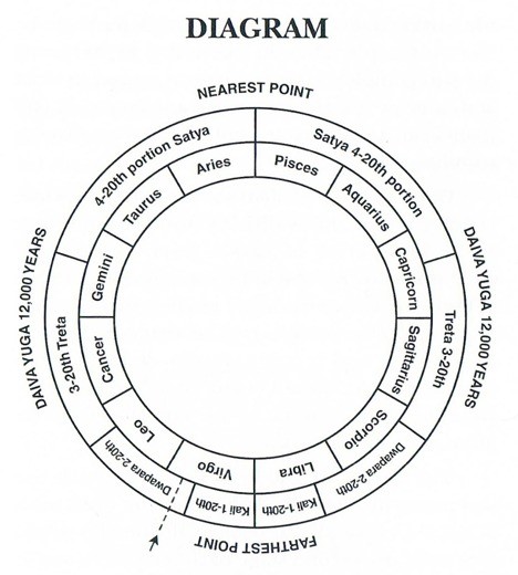 After 12000 years, when the sun goes to the place in its orbit which is farthest from Brahma, the grand centre (an event which takes place when the autumnal equinox is on the first point of Libra), dharma, the mental virtue, comes to such a reduced state that man cannot grasp anything beyond the gross material creation. Again, in the same manner, when the sun in its course of revolution, begins to advance toward the place nearest to the grand centre, dharma, the mental virtue, begins to develop; this growth is gradually completed in another 12000 years.