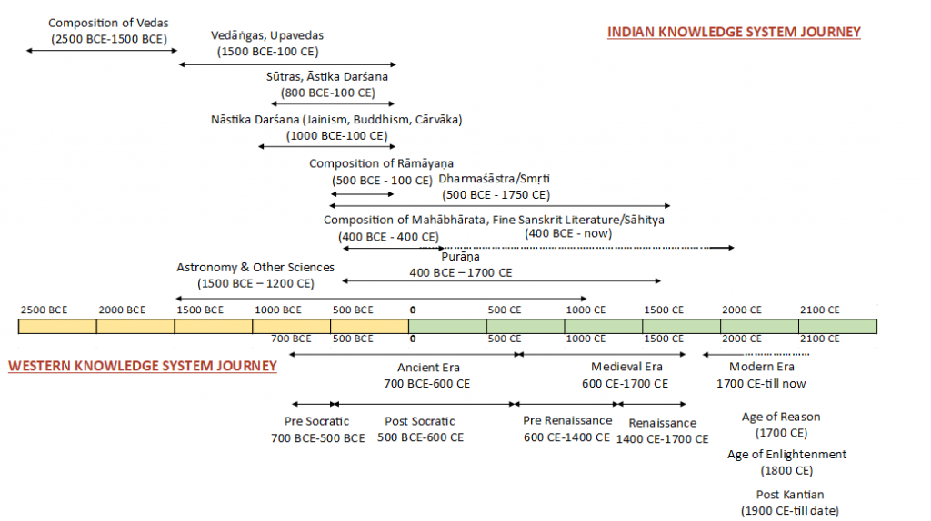 The diagram below depicts the chronological development of the Indian and Western knowledge system. The periods of compositions of various Indian scriptures are based on the best approximation.